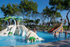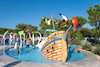 The baby pool completes the theme by featuring a large structure in the shape of a four-leaf clover set up with slides and water sprays. The whole arrangement takes up the central theme of pirates, with a stranded vessel hiding a slide and water jets that can be steered by rotating small rudders.