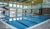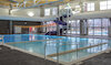 Indoor, Myrtha technology, "L" shaped pool with 6 lane x 25 yard competition area, 1 and 3 meter diving boards, small slide, large shallow area with steps, deck sprays and ADA accessible ramp.